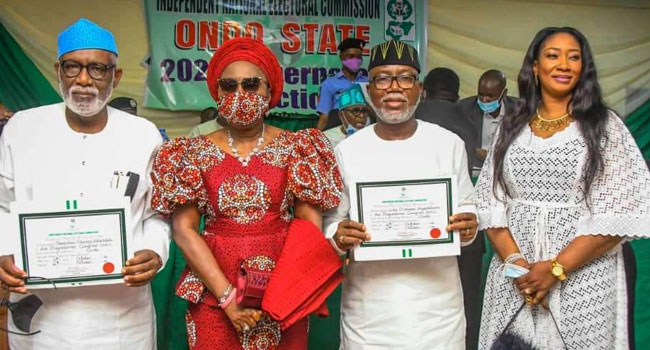 The Independent National Electoral Commission (INEC) has presented certificates of return to Governor Rotimi Akeredolu and his running mate, Lucky Ayedatiwa, in last Saturday’s governorship election.